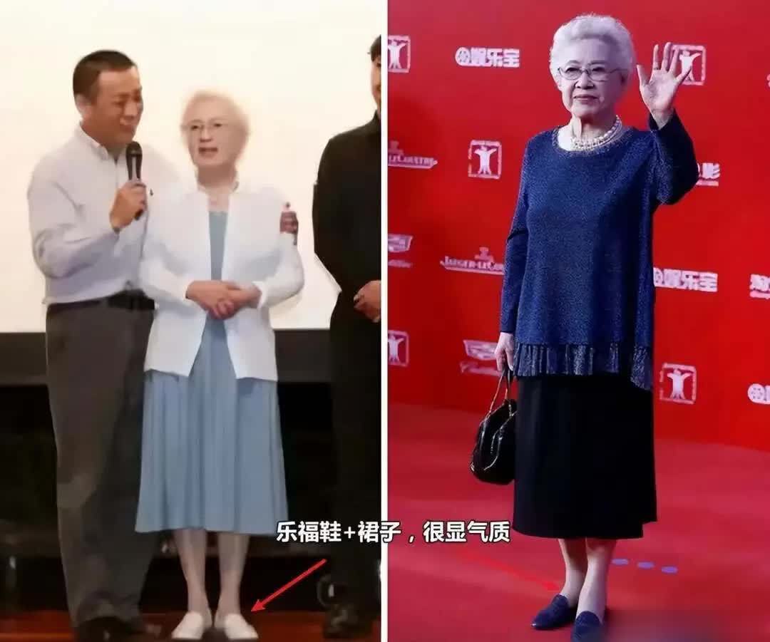 ③.穿裙不配运动鞋裙子搭配运动鞋显土气,秦怡穿搭几乎无运动鞋,穿带跟鞋,如乐福鞋,拉长腿型,增加造型呼吸感。
