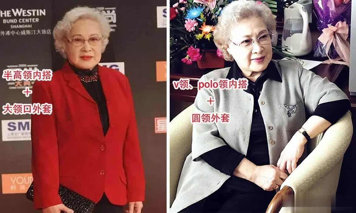 ②.亮色+基础色秦怡用亮色+基础色明暗结合,如深蓝色+黑色,提亮肤色,展现成熟女性稳重与知性。